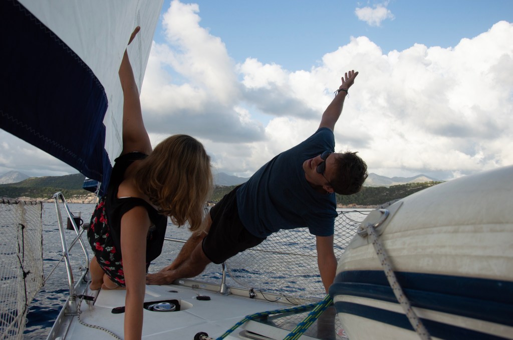 Gdyby ktoś się martwił – na łódce totalnie nie gnuśniejemy! Robimy sobie ćwiczonka, a coś, co lubię najbardziej, to nurkowanie na bezdechu wzdłuż liny kotwicznej! To jest cudne!
