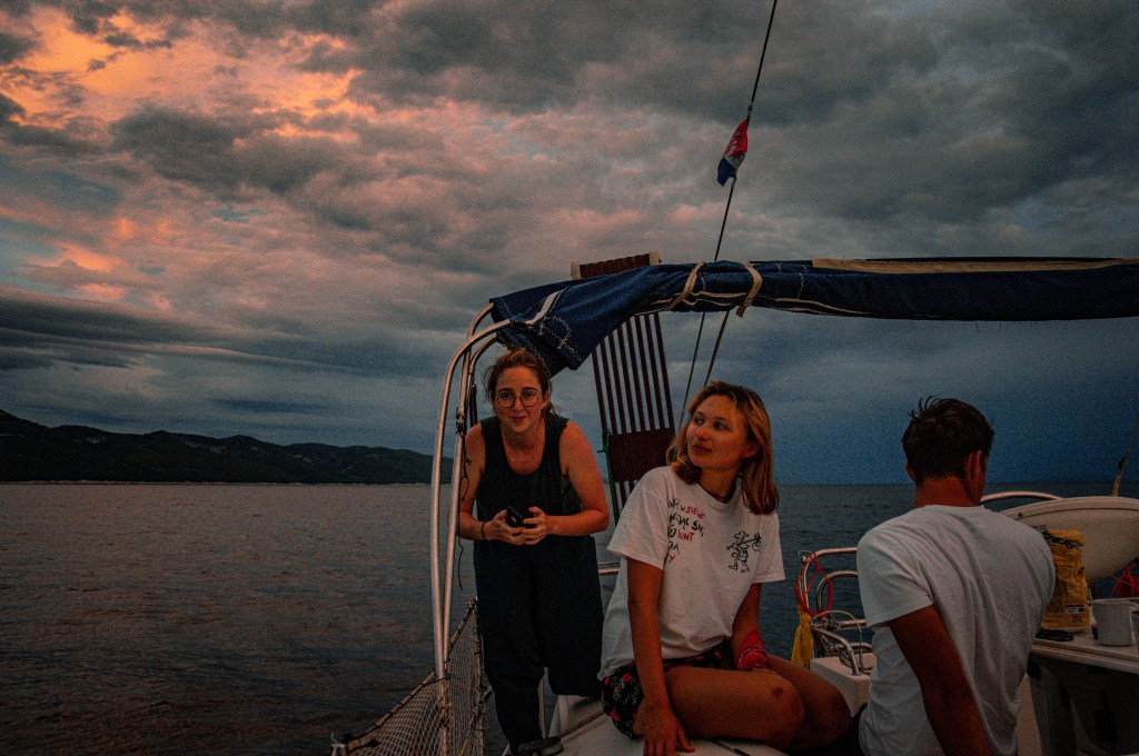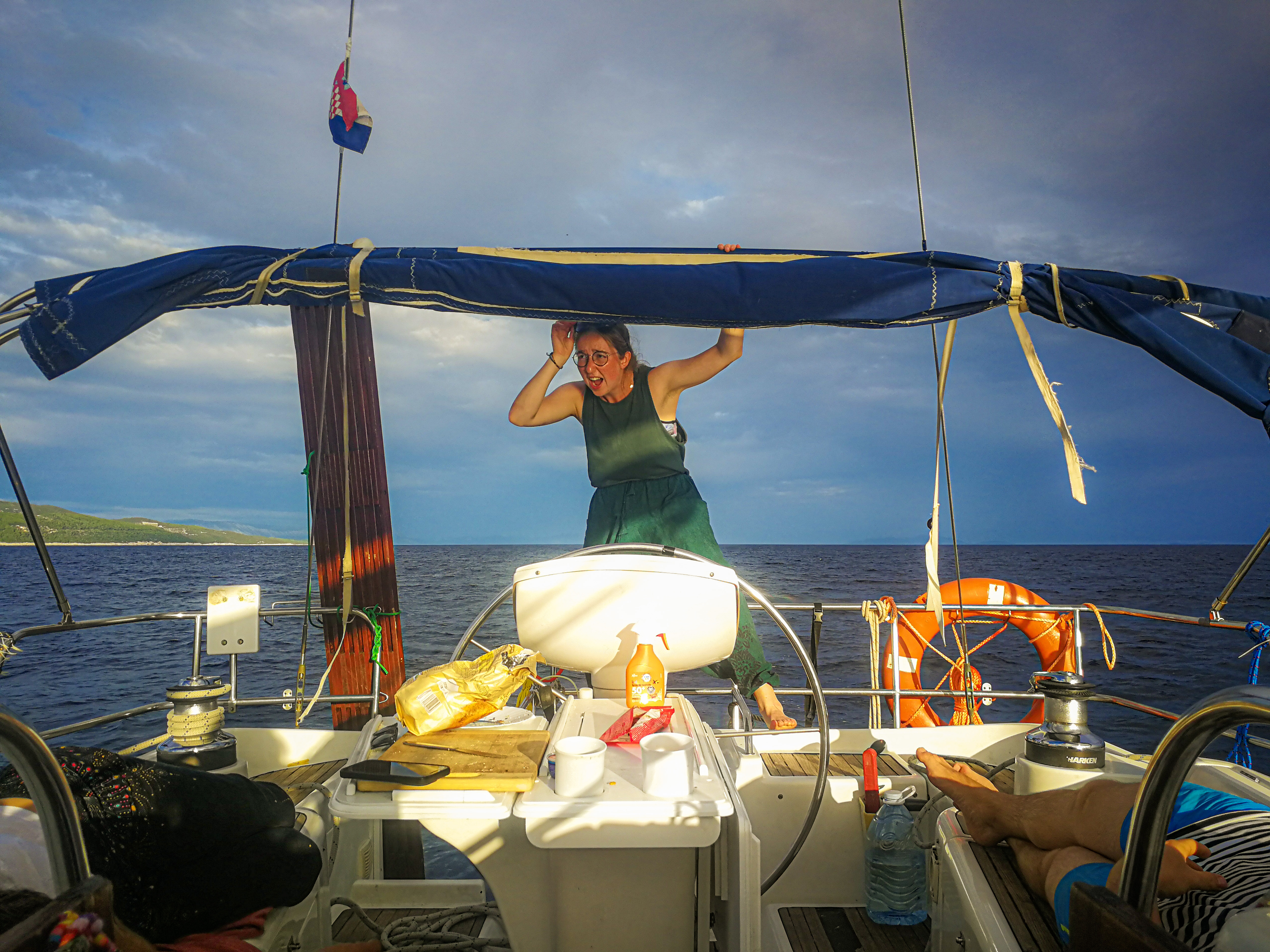 Słowem wyjaśnienia, są wachty nawigacyjne odpowiedzialne za trzymanie kursu i prowadzenie jachtu w ciągu żeglugi oraz wachty kotwiczne odpowiedzialne za czuwanie na wypadek zerwania kotwicy w nocy lub zmiany warunków pogodowych. Te obowiązki wymieniają się w ciągu dnia co kilka godzin, tak by każdy mógł odpoczywać 🙂