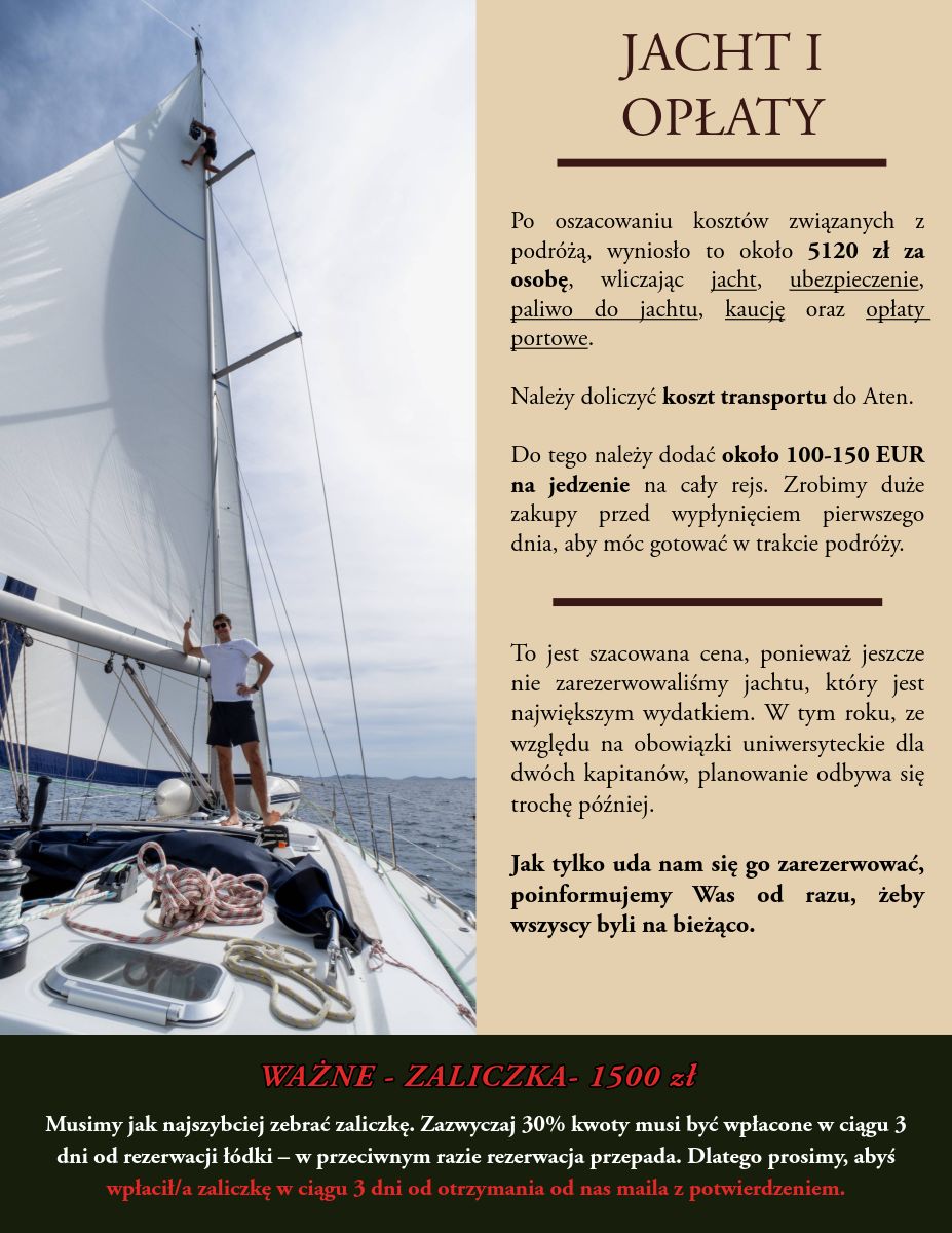 Koszt udziału to 5 200 zł, do tego należy doliczyć jedzenie (około 350 zł – wspólna zrzutka + ewentualne lokalne knajpki) oraz transport (najczęściej samolot do Aten i autobus do mariny). W cenie zawarte są wszystkie podstawowe opłaty (czarter, kaucja, paliwo, opłaty portowe, transit log), opieka skippera i instruktora oraz koszulki załogi.