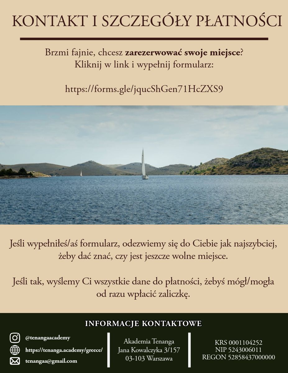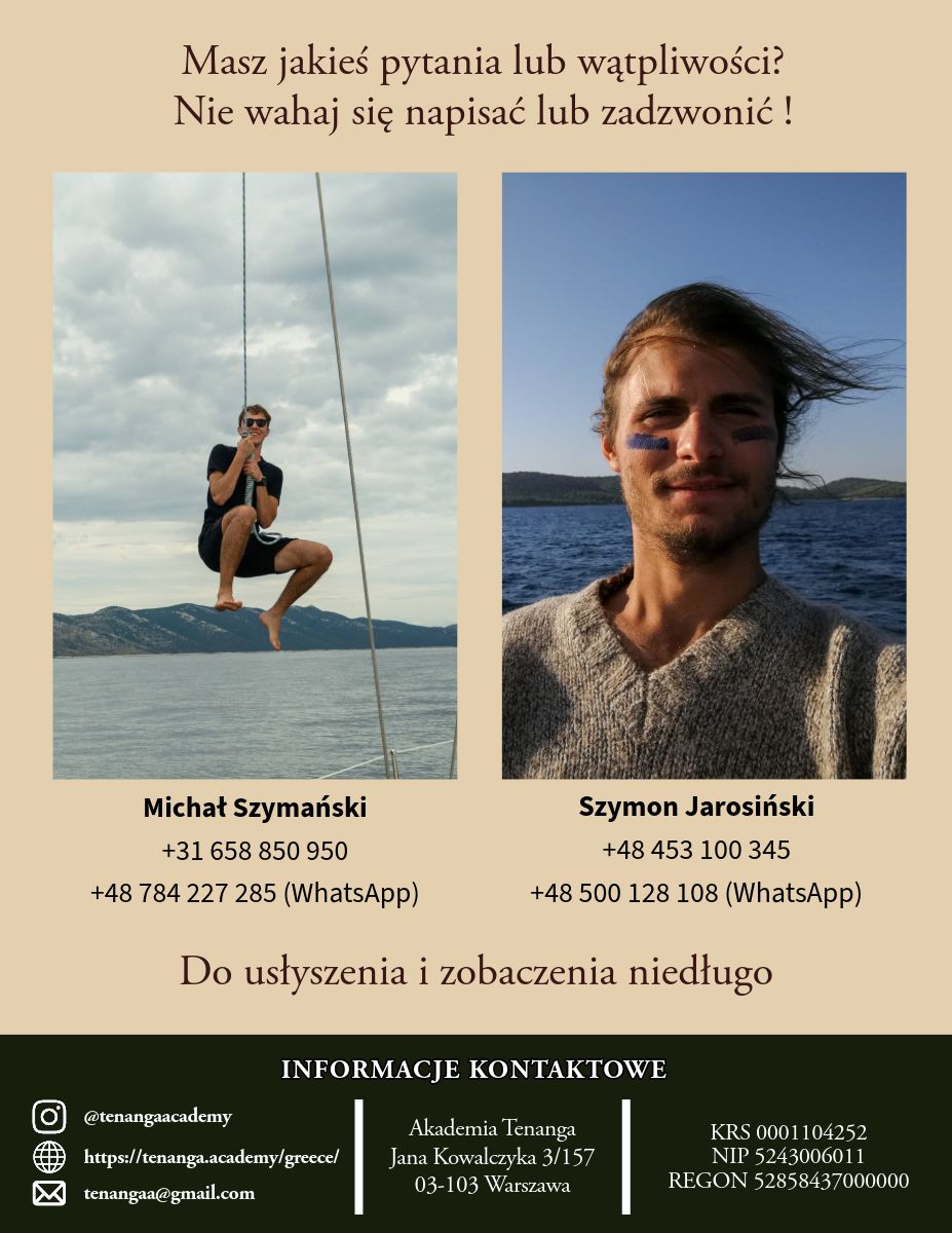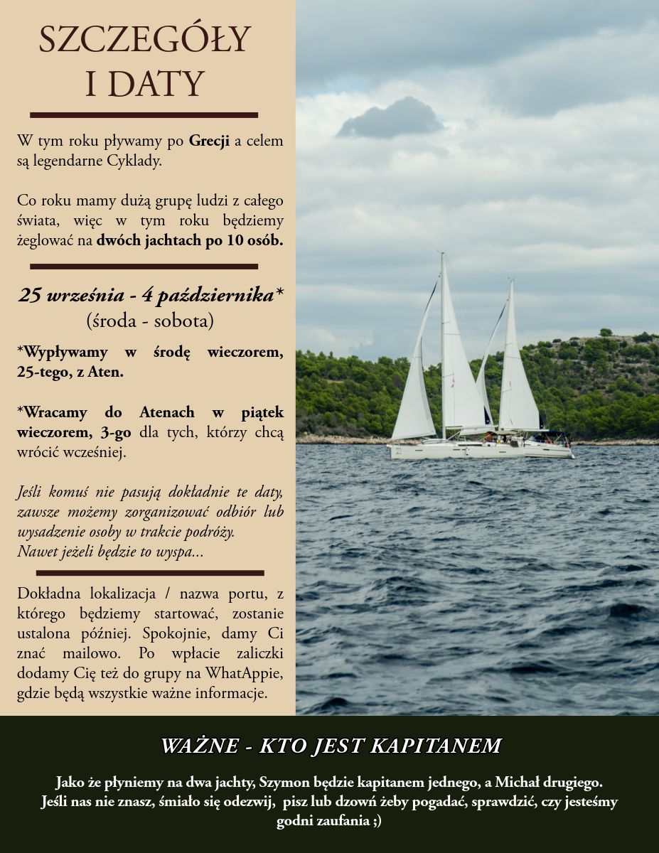 Startujemy z okolic Koryntu lub Aten i kierujemy się na Cyklady. Trasa zakłada sporo żeglugi i wachty – zarówno nawigacyjne, jak i kambuzowe – co pozwala każdemu członkowi załogi w pełni zaangażować się w życie na pokładzie. Dla osób, które będą pierwszy raz na morzu, to doskonała okazja, by w bezpiecznych warunkach, pod okiem instruktora, zdobyć solidne podstawy. Dla tych, którzy już pływali – szansa, by uporządkować wiedzę, przećwiczyć manewry i poczuć się jeszcze pewniej za sterem. Po rejsie wystawiam oficjalną opinię stażową zgodnie ze standardem PZŻ.